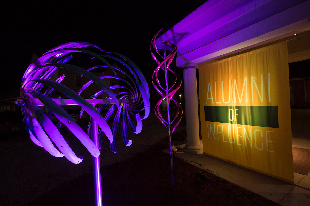 “Making kinetic sculpture is first and foremost problem-solving,” says White, the New Mexico-based artist who created the new art installation in the Vaninger Family Plaza at Hasselmann Alumni House. The site-specific piece, “The Infinity of Influence,” was dedicated during the university’s Alumni of Influence celebration on Nov. 5.